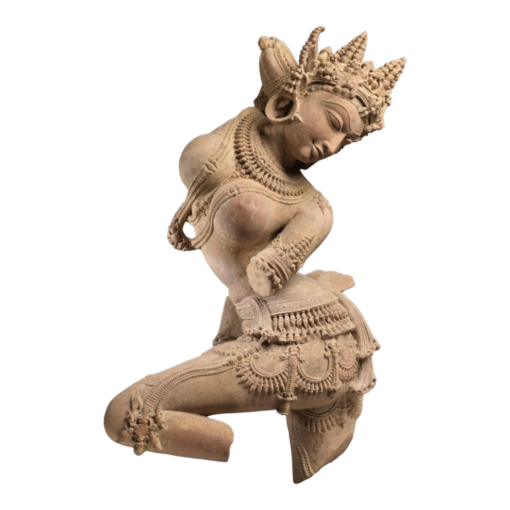 The sculpture features a celestial dancing figure defined by an elegant, sinuous curve, typical of classical Indian aesthetics as described in the Natyashastra. Her torso leans dramatically, creating a dynamic contrapposto that suggests fluid motion, as if she is captured mid-dance. The sculptor emphasises her body’s articulation, lifted shoulder, arched back, and shifted hips, conveying […]