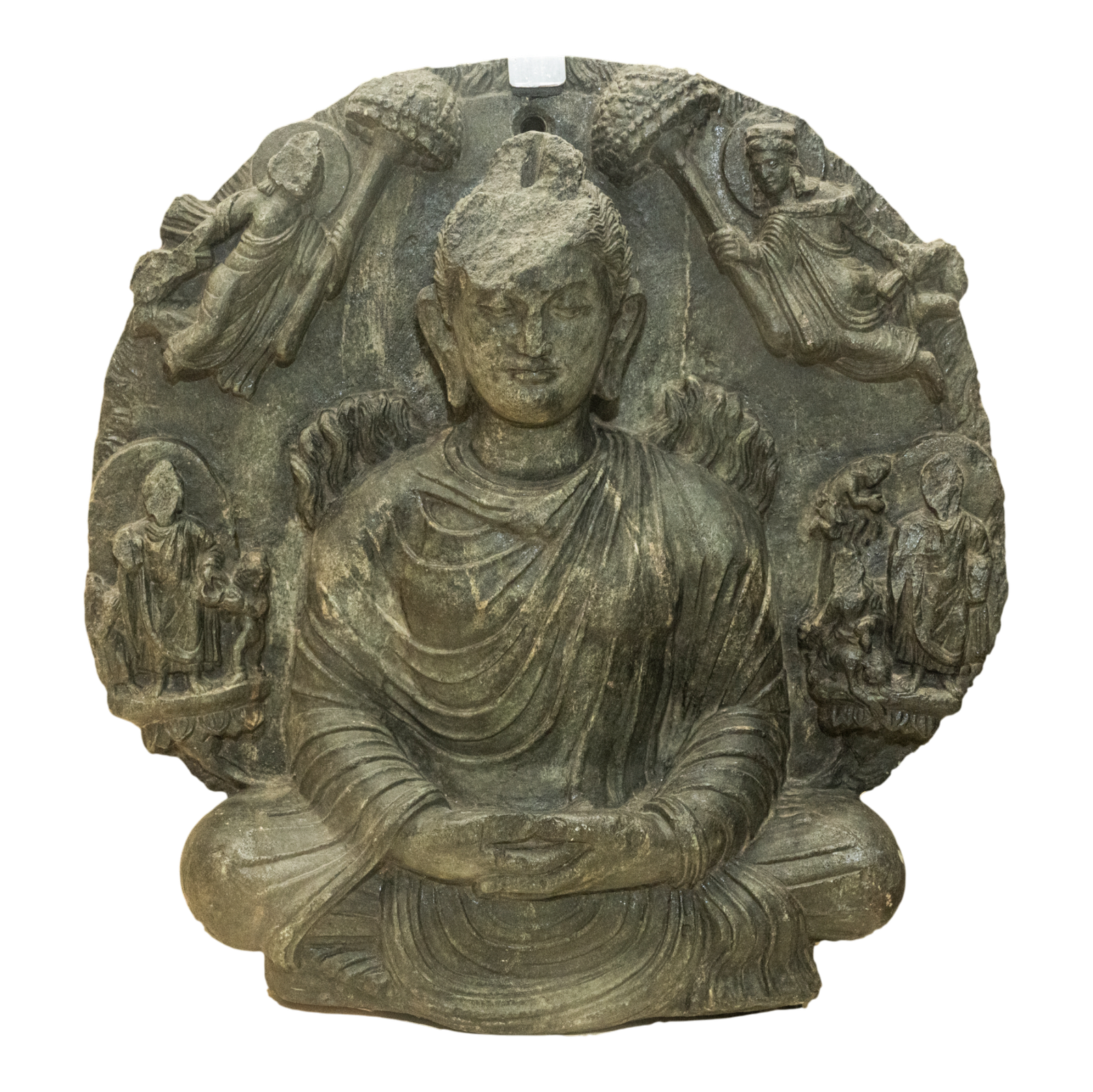 The Miracle of Śrāvastī from the Gandhara School portrays the Buddha performing the Twin Miracle, emitting flames and water from his body while multiplying his image to manifest his spiritual supremacy. Carved in gray schist, the Buddha sits in dhyana mudra, surrounded by smaller Buddhas and celestial figures. Flames rising from his back symbolize enlightenment and transcendence. This relief exemplifies Gandharan artistry, merging Greco-Roman naturalism with Buddhist symbolism, expressing the Buddha’s divine power and serene, enlightened presence.