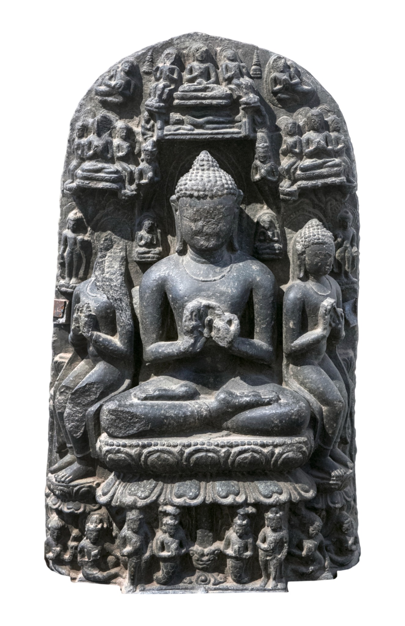 The Seated Buddha in Dharmachakra Pravartana Mudra from Bihar, created during the Pala period, represents the Buddha preaching his first sermon at Sarnath. Carved in black basalt, the Buddha sits cross-legged on a double-lotus throne, flanked by attendant bodhisattvas and smaller Buddhas. His hands form the Dharmachakra Mudra, symbolizing the Turning of the Wheel of Law. The composition reflects the Pala School’s refined modeling, serene expression, and intricate detailing, embodying both intellectual depth and spiritual radiance central to late Indian Buddhist sculpture