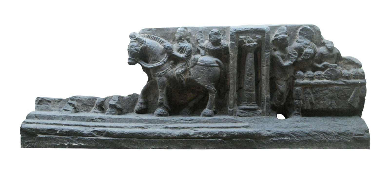 This Gandhara schist relief portrays the division and transportation of the Buddha’s corporeal relics following his Parinirvana. The scene captures figures handling sacred relics with reverence, accompanied by attendants and animals, symbolizing their distribution among various kingdoms. Executed in the Greco-Buddhist style, the composition combines realistic drapery, dynamic movement, and architectural detailing. The relief reflects the Gandhara School’s narrative artistry, emphasizing the sacred continuity of the Buddha’s presence through his relics and their devotional veneration.