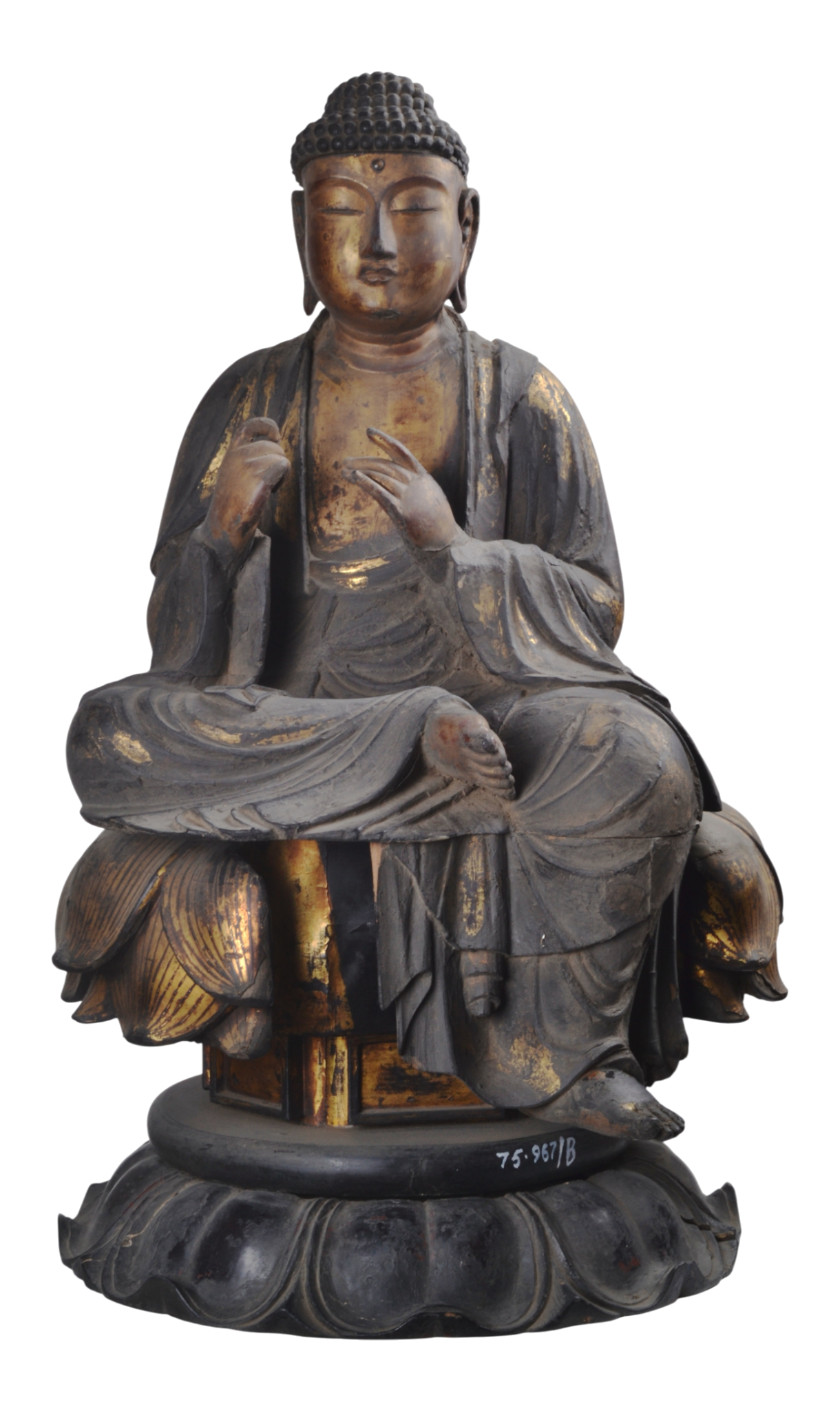 The Amitabha Buddha is portrayed in the dharmachakra mudra, a gesture symbolising the turning of the wheel of Dharma, seated in the elegant pendant-leg posture, known as lalitasana. This intricately crafted wooden sculpture comprises three distinct parts: the sturdy base that provides stability, the beautifully detailed lotus seat symbolising purity and enlightenment, and the serene seated figure of the Buddha, which captures a moment of profound meditation and spiritual wisdom. Each element has been thoughtfully designed to enhance the overall aesthetic and convey the deep spiritual significance associated with Amitabha.