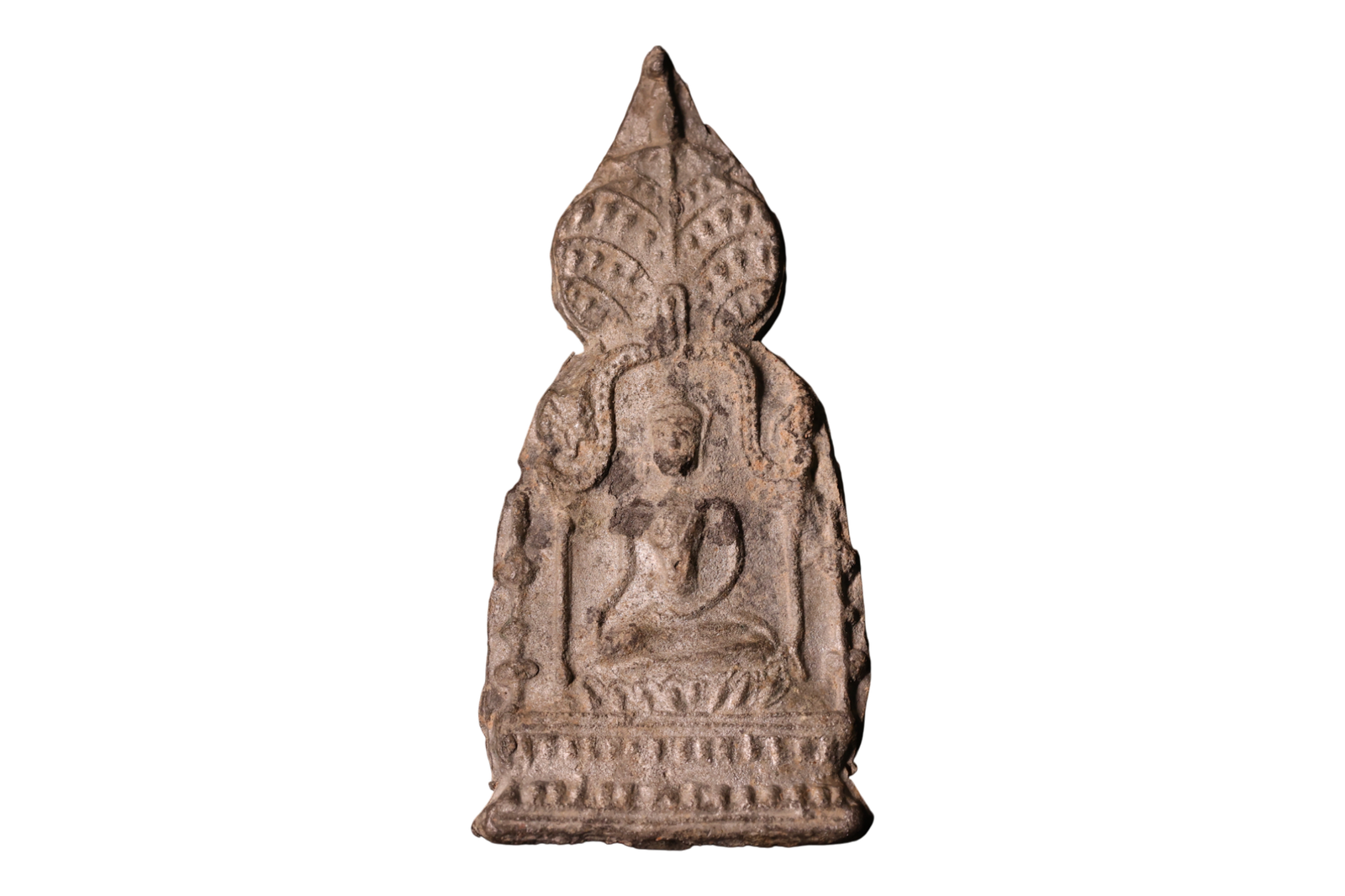 In Thai art, the tradition of crafting votive tablets and plaques has been a significant cultural practice since the Ayutthaya period. These artefacts are not only religious symbols but also serve as vital historical records of the era. The design of this particular figure, along with its decorative niche, showcases a harmonious blend of styles from both the Sukhothai and Ayutthaya schools of art. This fusion reflects the evolution of artistic techniques and thematic elements during this period, revealing Thailand’s rich artistic heritage and its continuity over time. The intricate details and symbolic imagery in these pieces highlight the skilled craftsmanship and the spiritual significance they held for the communities of the time.