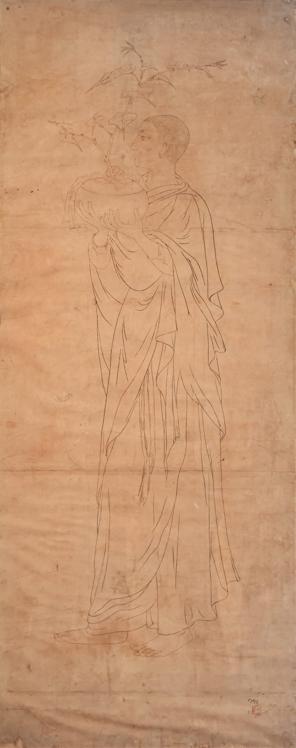 Nandalal Bose’s ink drawing portrays Sanghamitra, the daughter of Emperor Aśoka, as she carries a sacred Bodhi Tree sapling to Sri Lanka. Her calm demeanour highlights her vital role in spreading Buddhism. The artwork emphasises the tree’s significance as a symbol of Buddha, showcasing Sanghamitra’s dignity and serenity with expressive lines and an ethereal quality. In the 19th or 20th year of Aśoka’s reign, Sanghamitra travelled to Sri Lanka with ten nuns during King Devanampiya Tissa’s rule. She planted the Bodhi sapling in Mahameghavana garden in Anuradhapura and taught essential Buddhist texts, establishing the Bhikkhuni Order and ordaining Princess Anula and her companions. Sanghamitra lived in the Upasika-vihara, a nunnery comprising twelve buildings, and King Devanampiya Tissa later constructed additional nunneries around Thuparama.