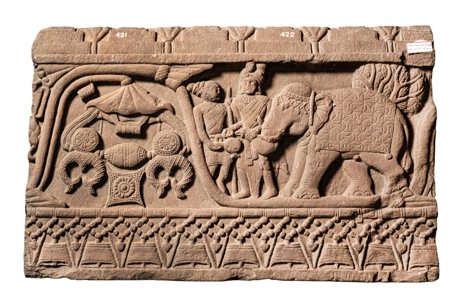 This coping stone fragment depicts the Vessantara Jātaka, illustrating the Bodhisattva’s supreme virtue of generosity (dāna). Born as Prince Vessantara, he donates his rain-bringing white elephant Peccaya to a Brāhmaṇa from Kaliṅga, symbolizing selfless giving. The panel shows the prince offering the elephant with ritual pouring of water. The panel depicts this moment of offering, symbolizing the Bodhisattva’s boundless compassion and ultimate renunciation leading toward Buddhahood.