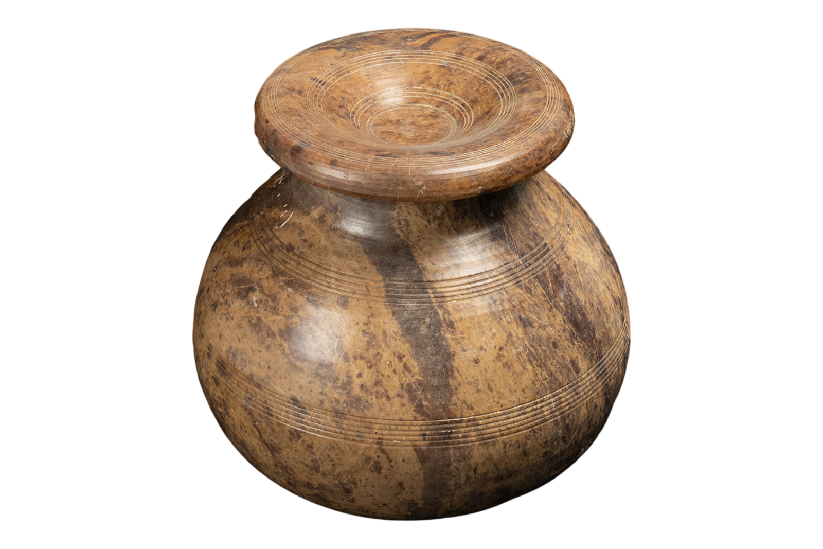 The globular-shaped steatite relic casket with a flared rim and fitted lid exemplifies the refined craftsmanship and aesthetic sensibilities of the Mauryan period. Carved from fine grey steatite, its smooth surface and balanced form highlight the advanced lapidary skills of the time. This casket, part of the assemblage associated with the sacred relics of Śākyamuni Buddha, once enshrined precious gems and jewels, serving as a revered container symbolising devotion, piety, and the enduring legacy of early Buddhist faith and art.