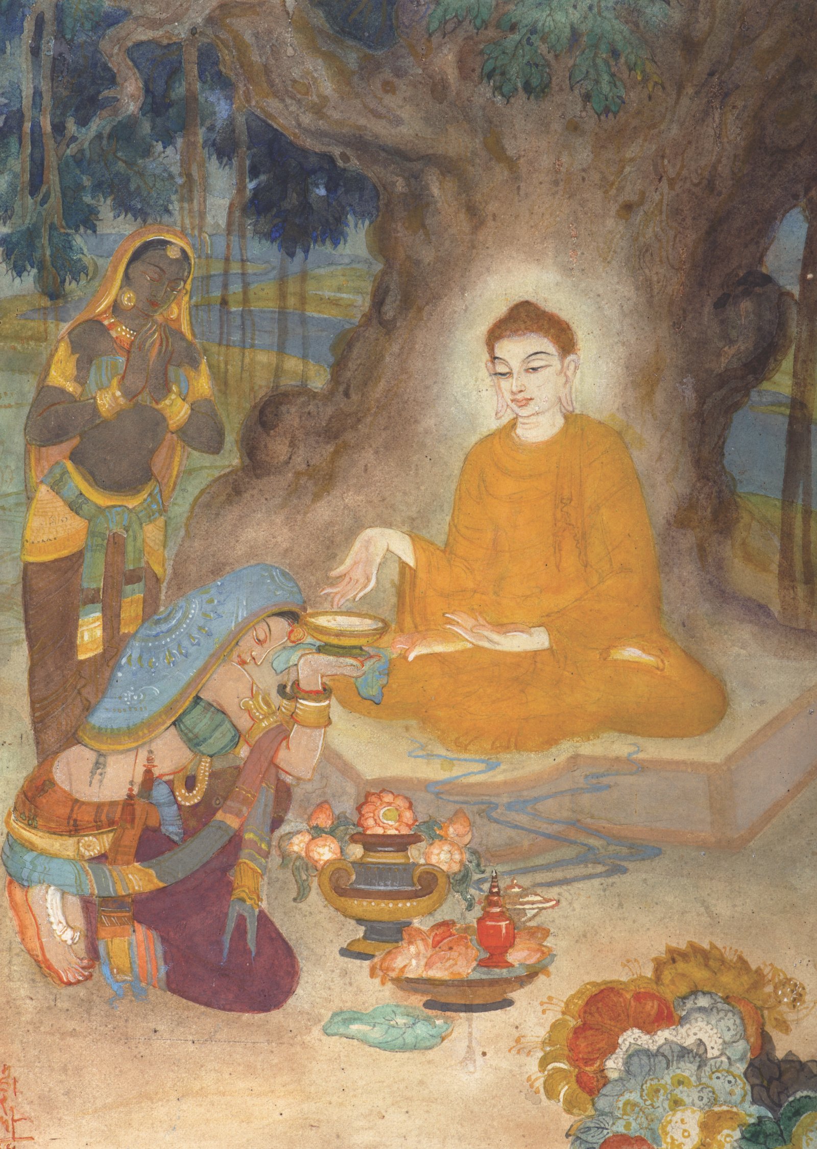 Upendra Maharathi beautifully reimagines a pivotal episode from Buddhist history — the moment Sujata, revered as the first Upāsikā, offers kheer to the emaciated Siddhartha Gautama. This act of compassion not only restored his strength but inspired his realization of the Middle Path, balancing austerity and indulgence.