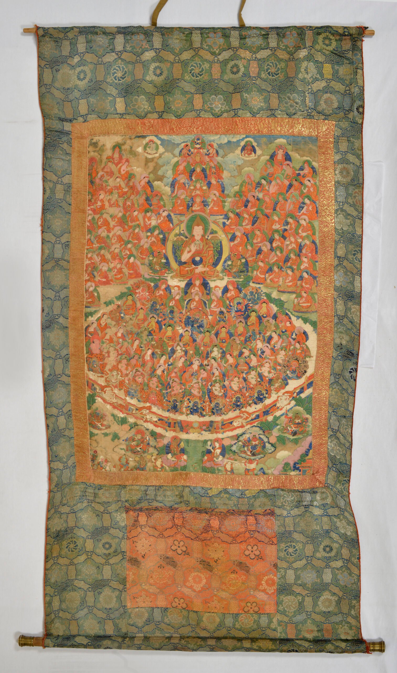 A Gelug Refuge Field Thangka is a detailed depiction of the spiritual lineage associated with the Gelug school of Tibetan Buddhism, often featuring Je Tsongkhapa or another significant teacher as the focal point. This thangka represents the “Tree of Refuge,” illustrating the hierarchical nature of refuge-taking among practitioners in the lineage of masters portrayed along its branches or resting on lotus supports. These thangkas serve both as meditation aids and as essential educational tools, conveying the transmission of teachings from Shakyamuni Buddha to present-day followers through the lamas. The layout of Gelug Refuge Field Thangkas includes a myriad of enlightened beings, teachers, and sages, each representing a vital link in the uninterrupted transmission of the Dharma. Typically located at the bottom of the composition are various Buddhas, Bodhisattvas, and Dharma protectors, which provide a safeguard for the lineage and its practices. The arrangement of figures follows a spiritual hierarchy, with the most prominent figures at the top and less significant ones below. Some thangkas draw on the Lamrim tradition, with Shakyamuni prominently placed at the centre, while others focus on the Lama Chupa practice, centring on the guru’s teachings. The artistic styles can vary, featuring designs arranged on lotus bases, in circular formats, or in panoramic landscapes, all rooted in the artistic traditions of Tashi Lhunpo Monastery and the lineage of the Panchen Lama. Such variations enrich the cultural and instructional value of these thangkas within the Gelug tradition.