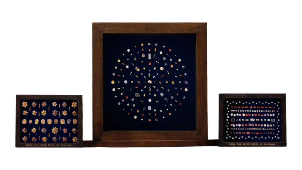 The Buddha relics from Piprawaha were unearthed by William Claxton Peppé in 1898. These gems, consisting of semiprecious stones, gold and silver leaf, pearls, and beads shaped into emblems such as tri-ratna, bird, leaf and lotus motifs etc. These were carefully mounted between glasses in three separate frames shortly after their excavation. The Peppé family […]