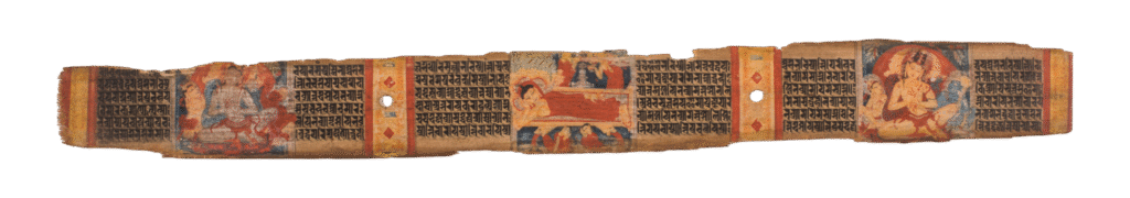 The 12th-century CE Mahaparinirvana Sutra manuscript from the Pala period, catalogued as Acc. No. 60.1653, depicts the Buddha’s final moments before entering Nirvana. It features the Buddha reclining on his right side, encapsulating his transcendence beyond the physical realm. Meticulously crafted and horizontally oriented, the manuscript integrates script and miniature artwork, reflecting a blend of […]
