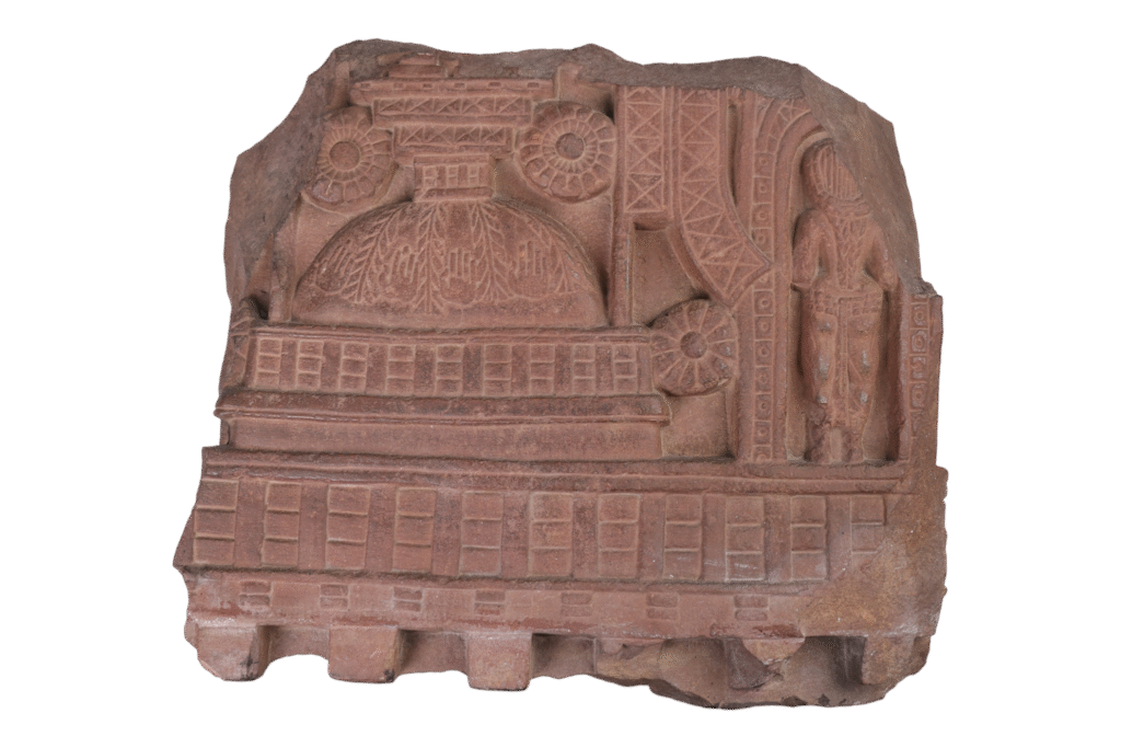 This relief fragment from Bharhut features a stupa enclosed by a railing, crafted from red sandstone. The adorned stupa occupies a substantial portion of the fragment, while about one-fourth of the space is dedicated to a female devotee entering the stupa’s enclosure to perform circumambulation (pradakshina). She approaches through one of the arched gateways set […]