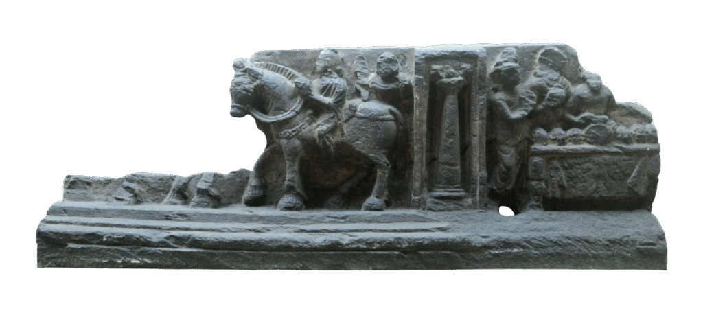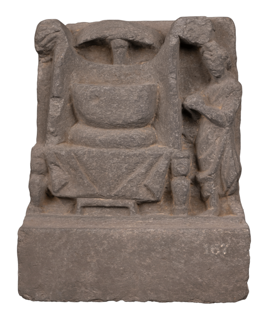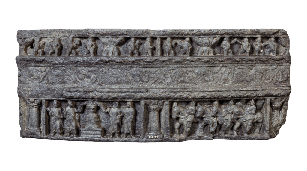 This Gandhara schist relief portrays the division and transportation of the Buddha’s corporeal relics following his Parinirvana. The scene captures figures handling sacred relics with reverence, accompanied by attendants and animals, symbolizing their distribution among various kingdoms. Executed in the Greco-Buddhist style, the composition combines realistic drapery, dynamic movement, and architectural detailing. The relief reflects […]