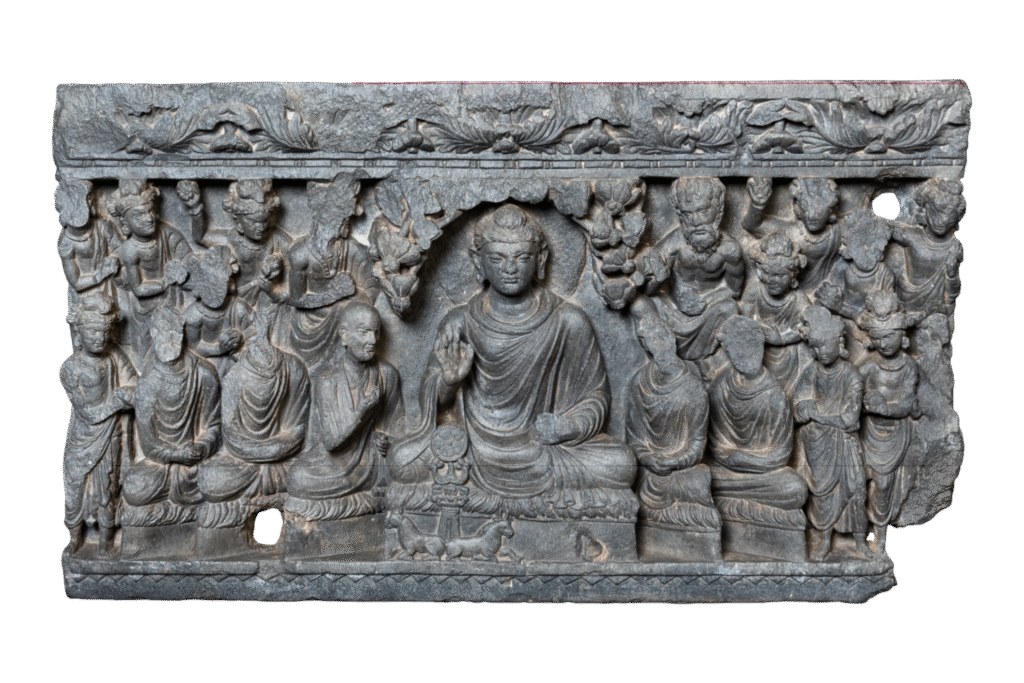 This exquisite Gandhara schist relief from the 2nd century CE portrays the First Sermon (Dharmachakrapravartana) at Sarnath, marking the Buddha’s first teaching after enlightenment. The Buddha, seated in dharmachakra mudra, expounds the Four Noble Truths to his five ascetic disciples, surrounded by celestial beings and attendants. Beneath his throne, the Wheel of Dharma flanked by […]