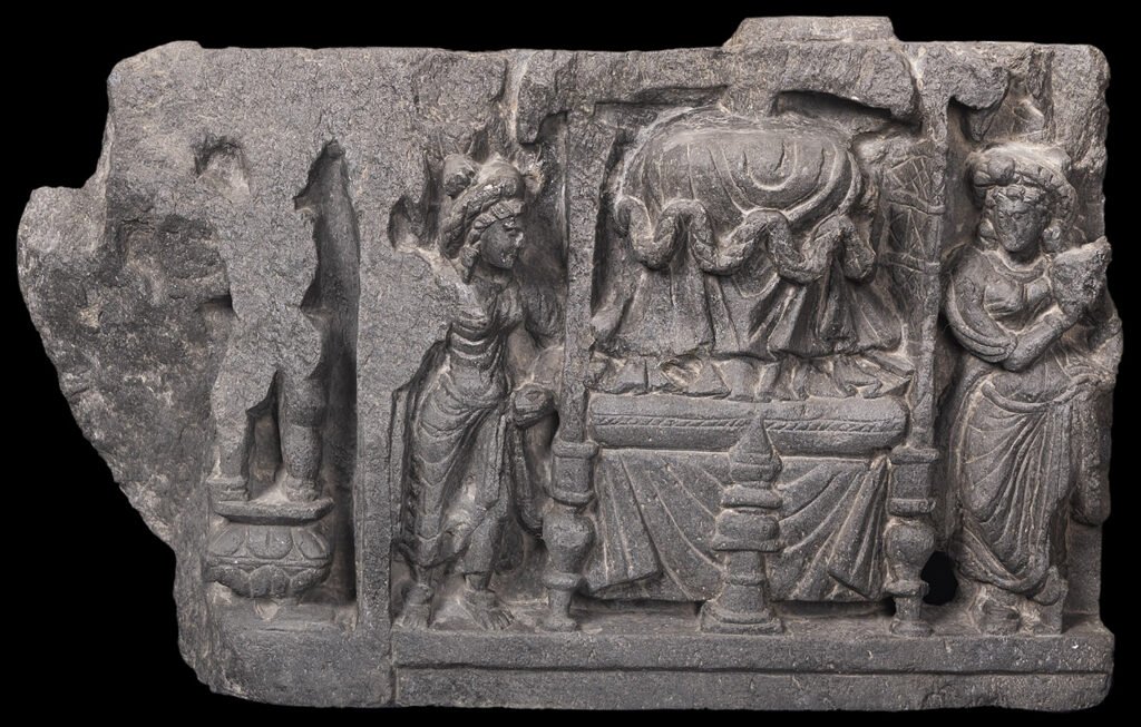 The Transportation of the Corporeal Relics of the Buddha from the Gandhara School depicts the solemn procession carrying the Buddha’s relics after his Parinirvana. Carved in gray schist, the relief shows devotees and attendants escorting a reliquary, accompanied by royal figures and musicians. The composition reflects Gandharan realism—detailed drapery, expressive figures, and architectural framing—while emphasizing […]