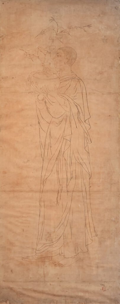 Nandalal Bose’s ink drawing portrays Sanghamitra, the daughter of Emperor Aśoka, as she carries a sacred Bodhi Tree sapling to Sri Lanka. Her calm demeanour highlights her vital role in spreading Buddhism. The artwork emphasises the tree’s significance as a symbol of Buddha, showcasing Sanghamitra’s dignity and serenity with expressive lines and an ethereal quality. […]
