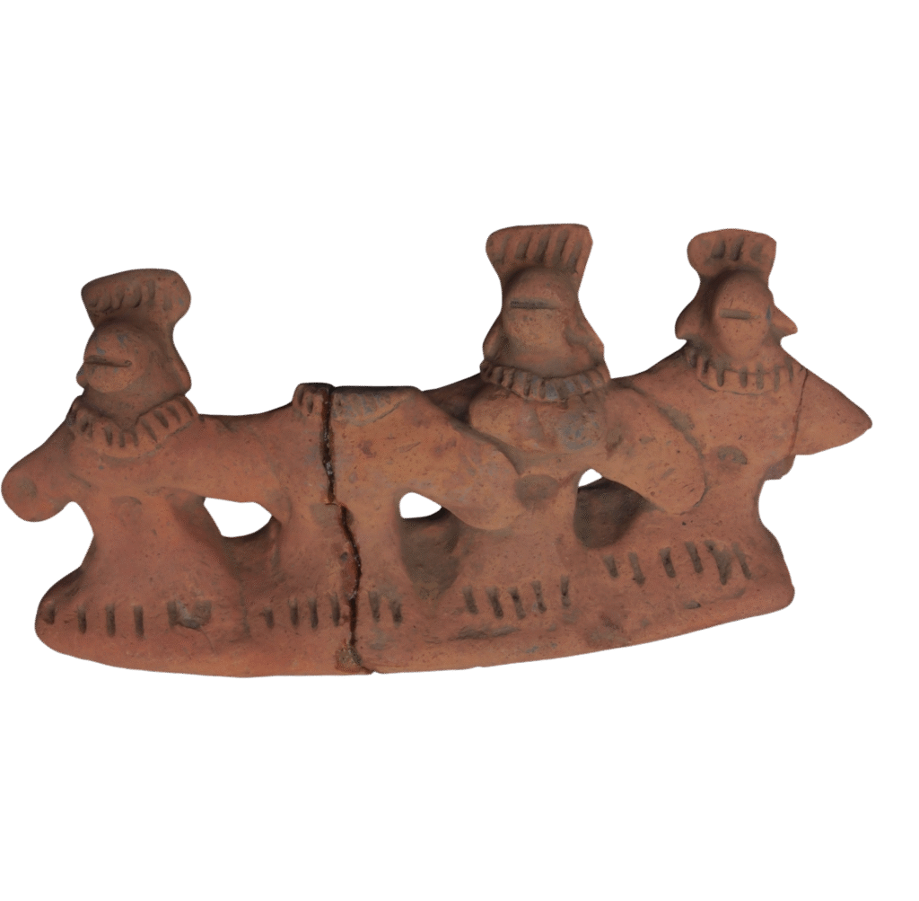 Four simple dancing anthropomorphic figures with their hands joined, are presented together on a common pedestal. These figures appear to be belonging to the folk cult associated with mother goddesses. Special emphasis is given to the rendering of ornamentation through parallel incision marks. The figures are shown with decorative headgear and heavy necklaces. Incised lines […]