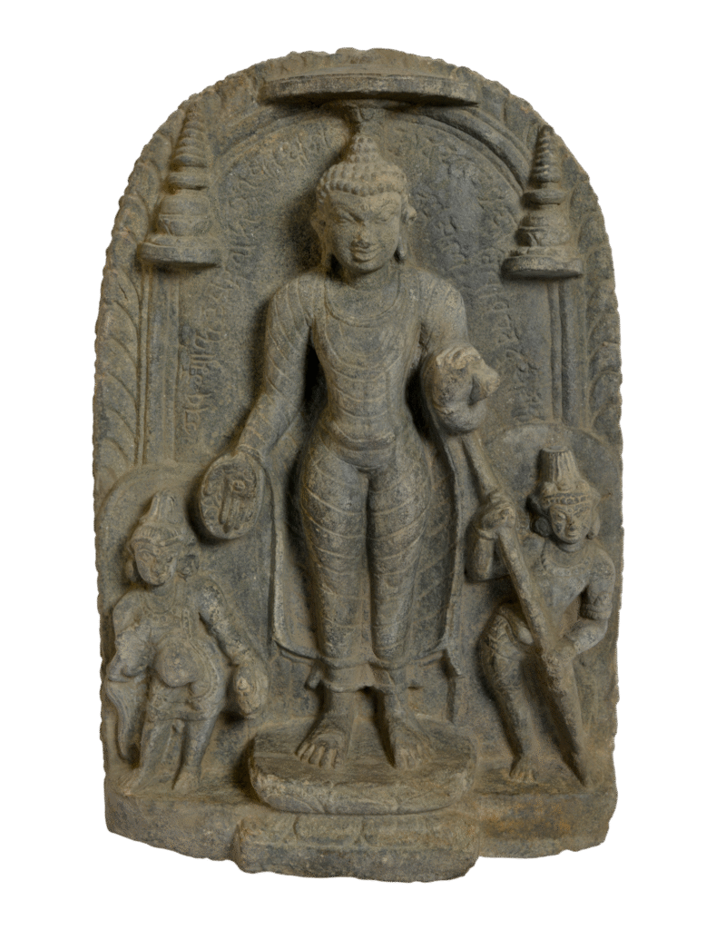 Another important event of in the life of Buddha is the descent from the heaven the thirty-three gods (Trāyastriṁśa), where he had gone to preach dharma to his mother for three months. This stele depicts Buddha in a frontal pose, his right hand in the boon-bestowing gesture (varada mudra). The Hindu deities, Brahma and Indra, […]