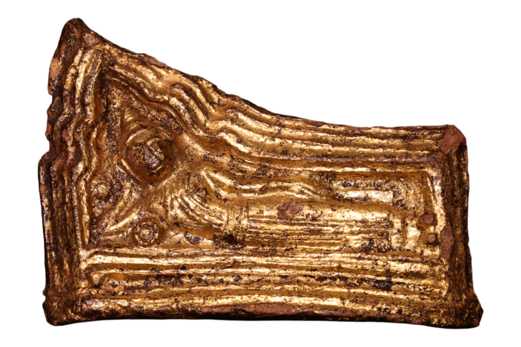 A gilded votive tablet depicting the reclining Buddha in the state of mahaparinirvana exemplifies the iconography associated with the Buddha’s final moments. This subject matter is extensively represented in both Indian and Thai votive artefacts, highlighting the cultural significance and artistic traditions surrounding this pivotal event in Buddhist narrative.