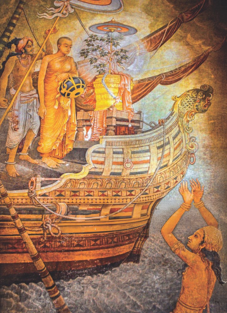 Solias Mendis’s 20th-century mural depicting Theri Sanghamitta’s arrival at Kelaniya Raja Maha Vihara captures a pivotal moment in Sri Lankan history with impressive detail. In a Neo-Classical style inspired by Ajanta, the mural features vibrant, earthy colours and highlights the event’s royal grandeur. It depicts Sanghamitta on an ornate ship, accompanied by the sacred Bodhi […]