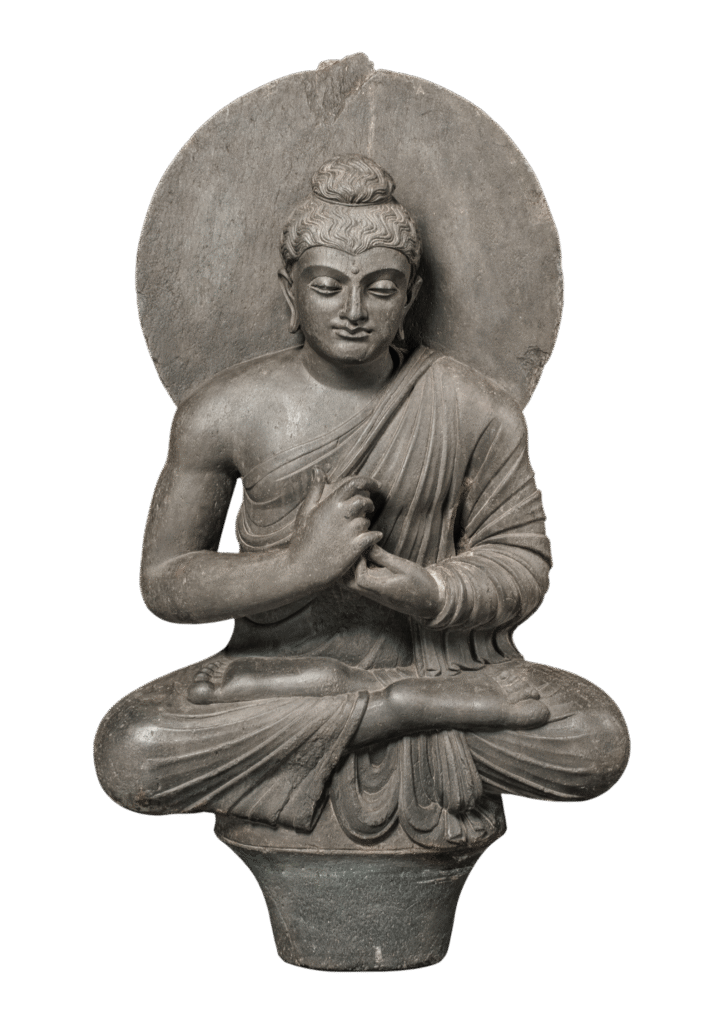 The Seated Buddha from Gandhara is a remarkable example of Greco-Buddhist art. Carved from gray schist, it depicts the Buddha in the dharmachakra mudra (gesture of teaching). The figure combines Hellenistic naturalism—seen in the drapery folds and realistic body form—with Indian spiritual iconography. The serene expression, halo, and monastic robe exemplify Gandhara’s unique synthesis of […]