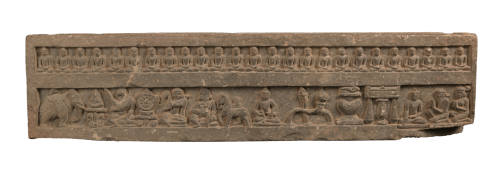 This Pala School stone relief illustrates the Seven Jewels (Saptaratna) and the Book of Worship, key symbols of both spiritual and temporal sovereignty in Buddhism. The panel includes the Wheel, Elephant, Horse, Jewel, Queen, Minister, and General, representing the perfections of a universal ruler (Chakravartin). Above, rows of seated Buddhas emphasize the continuity of enlightenment. […]
